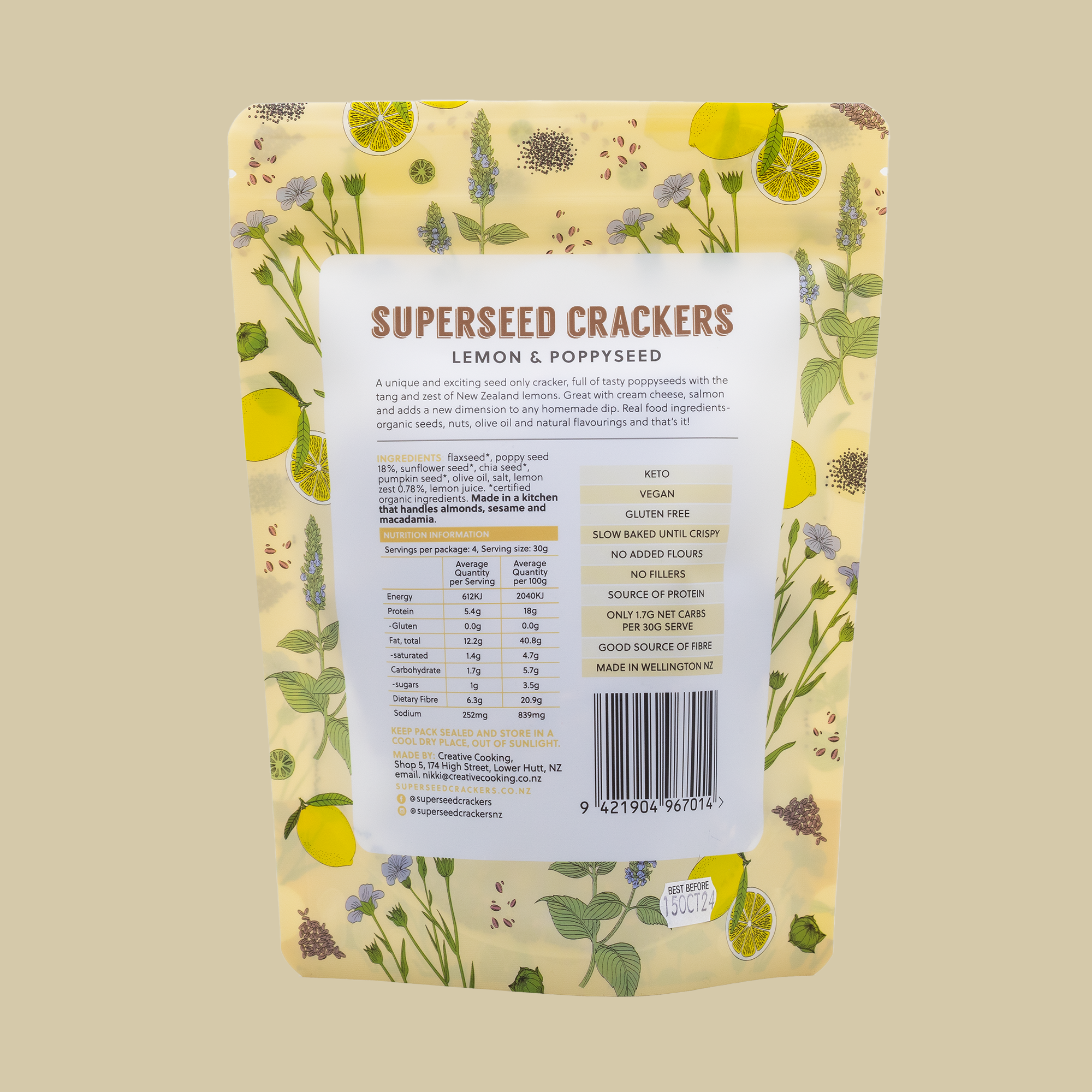 A unique exciting new cracker flavour full of tasty poppyseeds with the tang and zest of New Zealand lemons. Great with cream cheese, salmon, and adds a new dimension to any homemade dip.