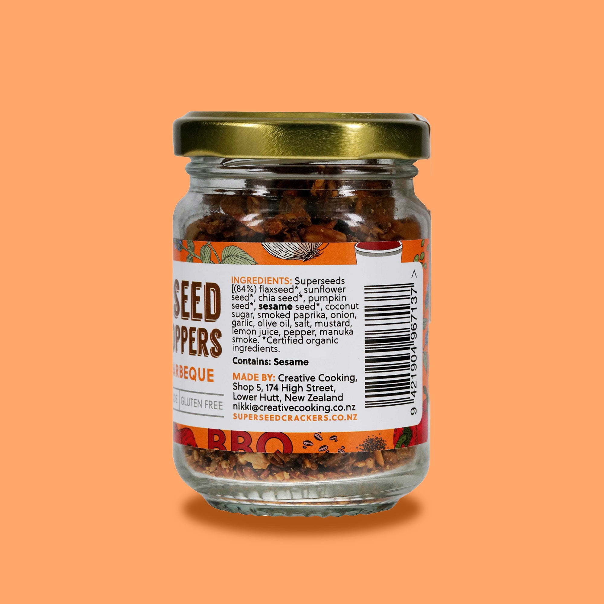 Ingredients: Flaxseed, sunflower seed, chia seed, pumpkin seed, coconut sugar, smoked paprika, onion, garlic, mustard, lemon juice, manuka smoke flavour, olive oil, salt, and pepper.